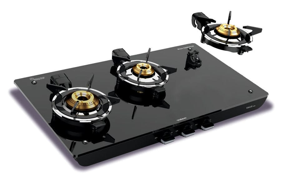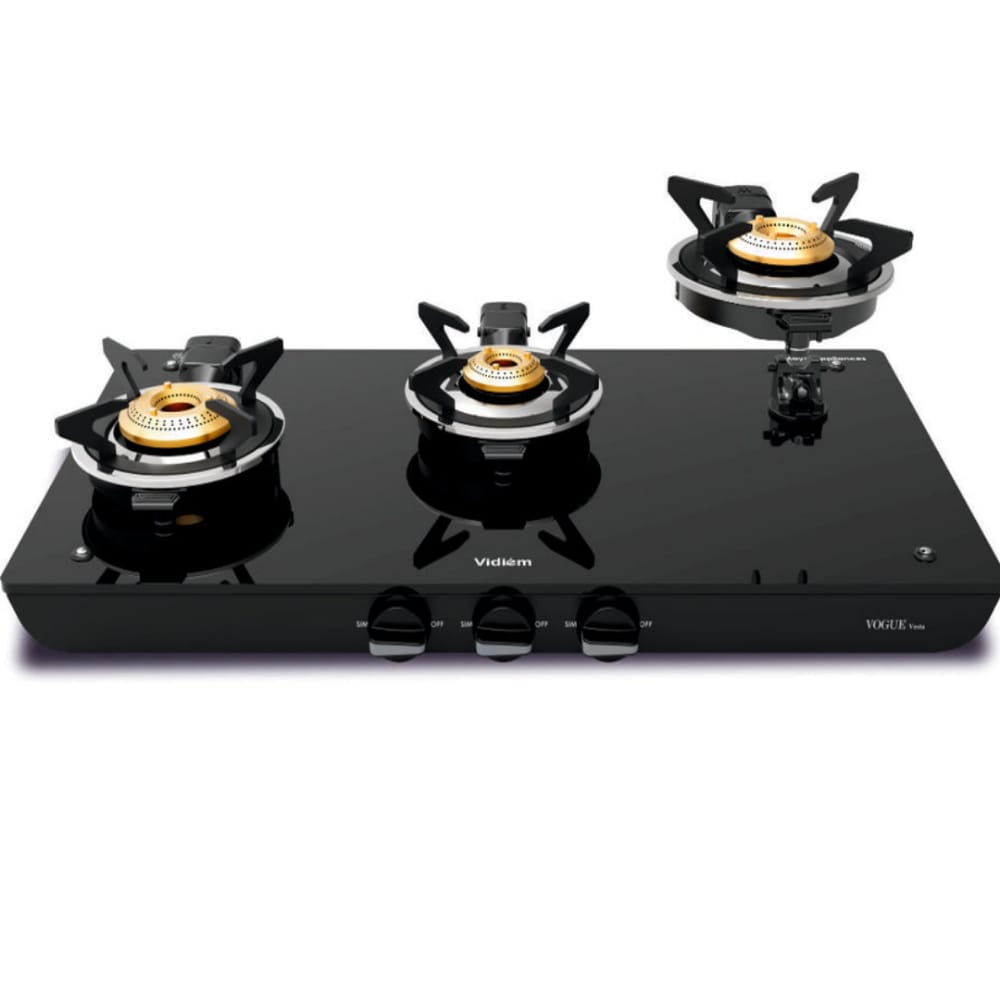 Vidiem Edge Shine Gas Stove | 8mm Toughened Glass Top | Extra Large Cooking Surface | Heavy-Duty Brass Burners | Manual Ignition | Lifetime Glass Warranty (3 Burner)