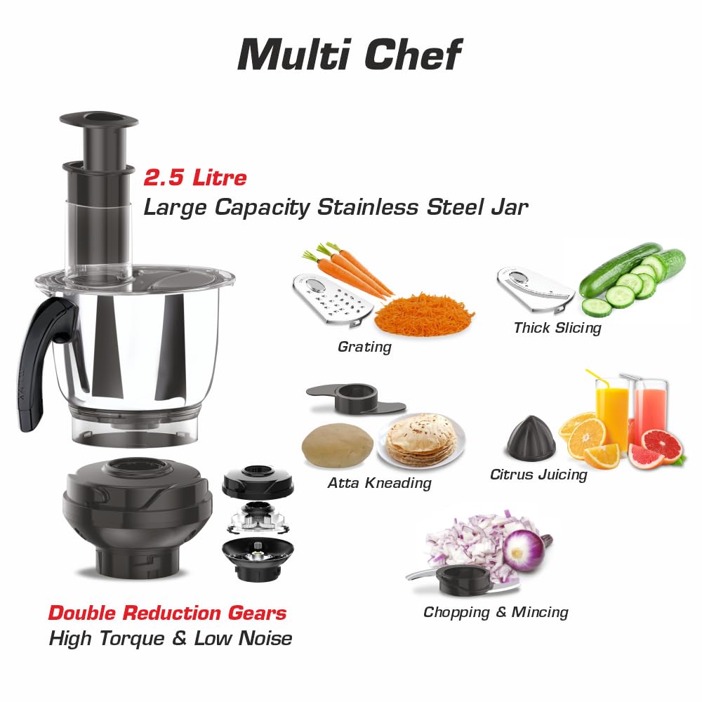 Vidiem ADC,mixer grinder 750 watt+ – Your All Day Companion Mixing, Grinding, Grating, Crushing, Juicing, Blending, Liquidizing, Extracting, Thick & Thin Slicing, Chopping,Mincing, Coconut Grating , Atta Kneading, Citrus Juicing. 2 Litre Stainless Steel Multi Chef with Double reduction Gear Box for High Torque & Low Noise with Polycarbonate Lid.