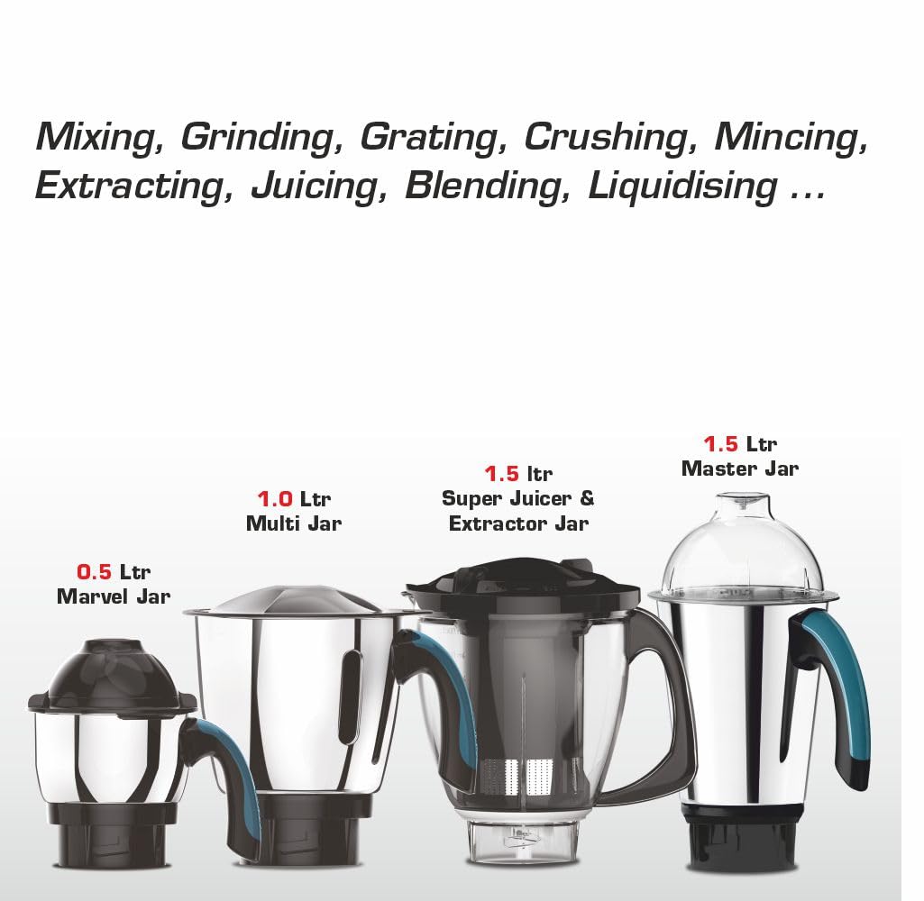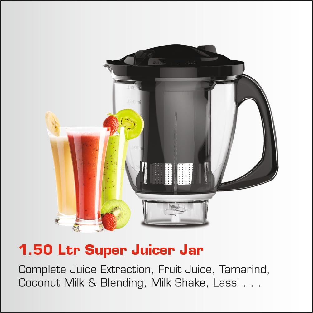 - 4 Versatile Jars for Every Kitchen Need : Comes with a set of 4 jars – 1.5 L Juicer Jar, 1.25 L Wet Grinding Jar, 1 L Multi-Purpose Jar, and 0.5 L Chutney Jar – for blending, juicing, mixing, and grinding multiple recipes effortlessly.